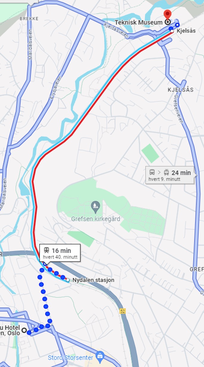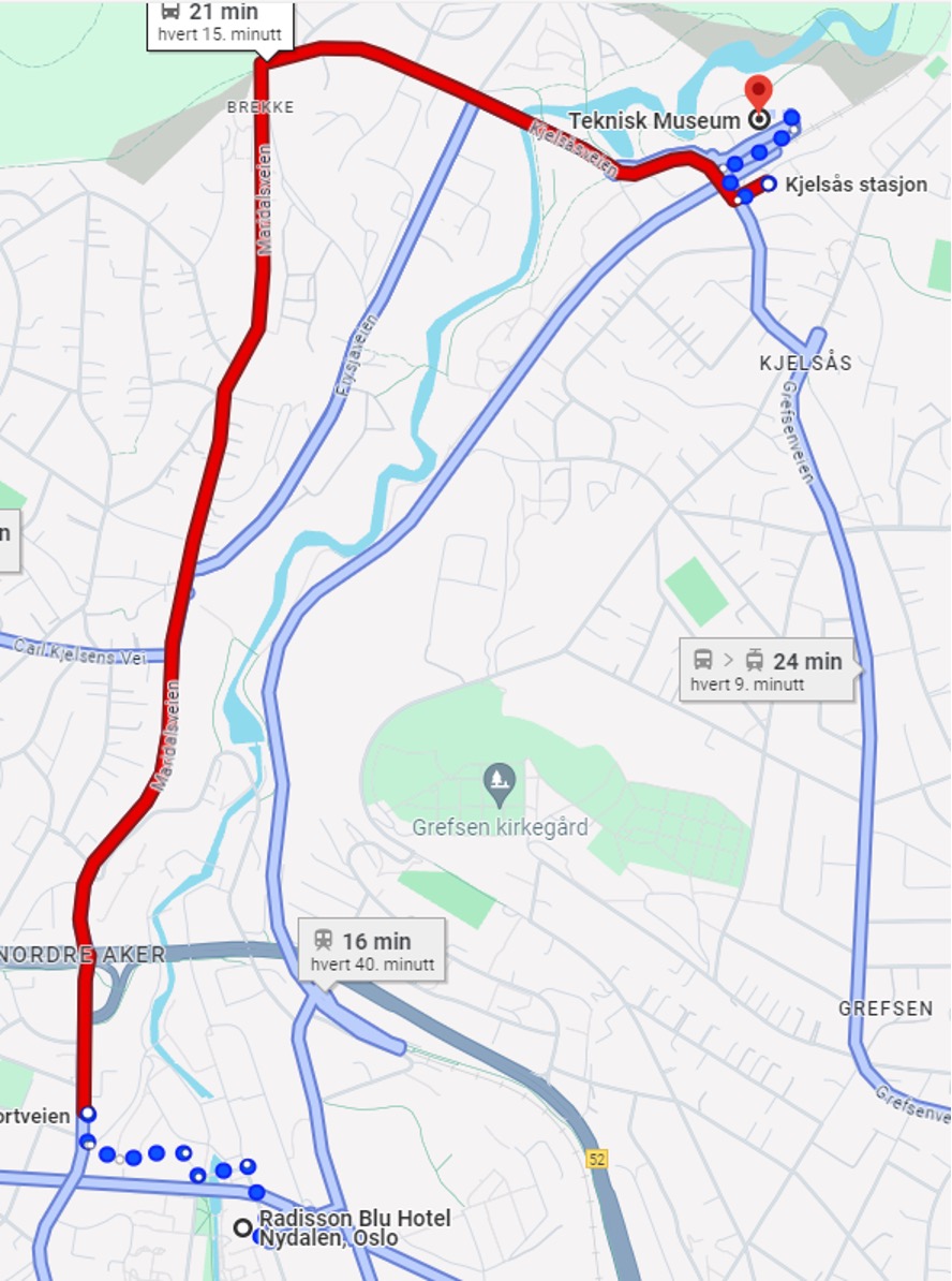 Gå til Blåsbortveien (9 min). Bussen går derfra klokka 13.41 og er på Kjelsås stasjon kl. 13.50. Gå til museet (5 min).