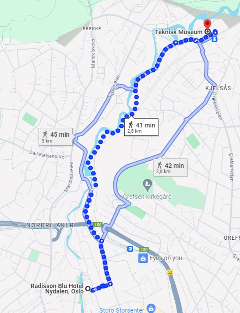 Gå til Nydalen stasjon (12 min). Toget går derfra kl. 13.13 og er på Kjelsås kl. 13.16. Gå til museet (1 min)
